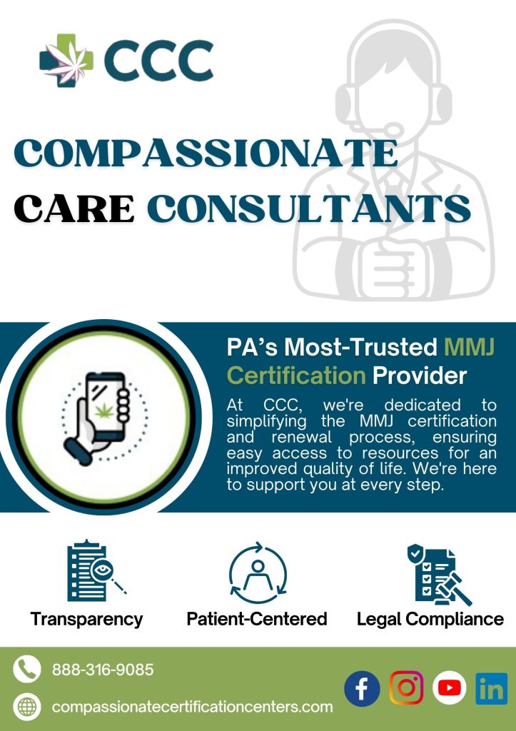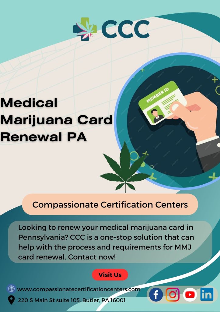 Renew your medical marijuana card conveniently with us at Compassionate Certification Centers. We make cannabis card renewal easy, especially for people in Pennsylvania. If you require renewing of your PA medical marijuana card or any other cannabis card, we are determined to assist with our efficient services. Make sure your medical marijuana access remains continuous .let Compassionate Certification Centers help with renewal and deliver the service with utmost courtesy. contact us today to ensure that you can renew your policy without hitches.